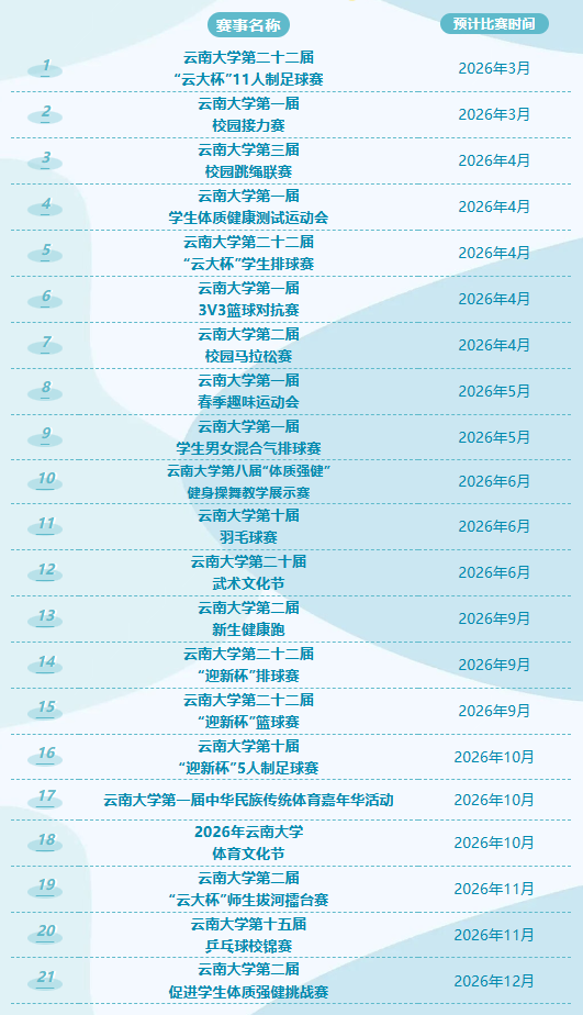 为贯彻落实教育部等五部门《关于实施学生体质强健计划的意见》,大力践行“健康第一”教育理念,落实学校 “课堂·田野·操场 ”育人举措,丰富校园体育文化生活,打造云大特色群众性校园体育品牌,beat365正版唯一官网必一体育运动委员会结合年度工作安排,现发布2026年度群众性体育赛事计划,诚邀广大师生踊跃参与,在运动中绽放活力、共享健康。