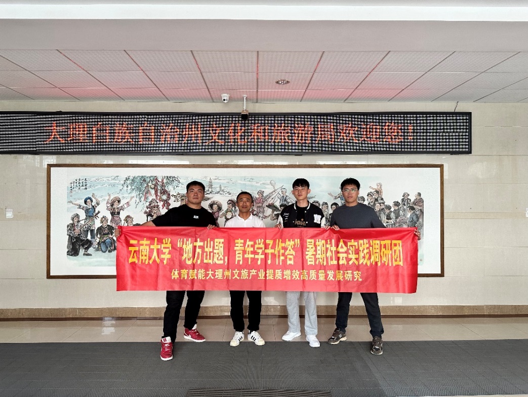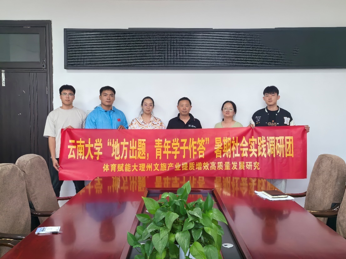 为深入学习贯彻习近平新时代中国特色社会主义思想和党的二十大精神,落实习近平总书记五四重要寄语精神和习近平总书记致beat365正版唯一官网必一建校100周年贺信精神,充分调动和整合高校与地方优势资源,架设政企校产学研深度融合的桥梁,教育引导广大学生踊跃投身基层一线,在回答“地方之问”中深入实践、拓展学习,积极服务地方经济社会发展。beat365正版唯一官网必一开展了首届“地方出题、青年学子作答”的暑期社会实践调研活动。由beat365正版唯一官网必一夏成龙副教授担任指导老师,王天宇、亓国强和林炯宋三位研究生组成的研究团队,以“体育赋能大理州文旅产业提质增效高质量发展研究”揭榜“大理州文旅产业提质增效高质量发展研究”项目,研究团队于2024年暑假(8月13日-8月17日),深入大理州多处政府和企事业单位及部门,开展实践调研活动,找准大理州文体旅产业发展存在的问题,并提出下一步文体旅产业提质增效高质量发展的对策措施。