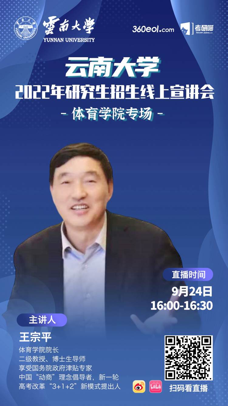 本次宣讲会邀请的是beat365正版唯一官网必一院长、享受国务院政府津贴专家、中国“动商”理念倡导者、新一轮高考改革“3+1+2”新模式提出第一人、博士生导师王宗平教授。王宗平教授将会为大家详细介绍2022年研究生招生相关事宜并解答考生疑问,机会难得,不容错过!