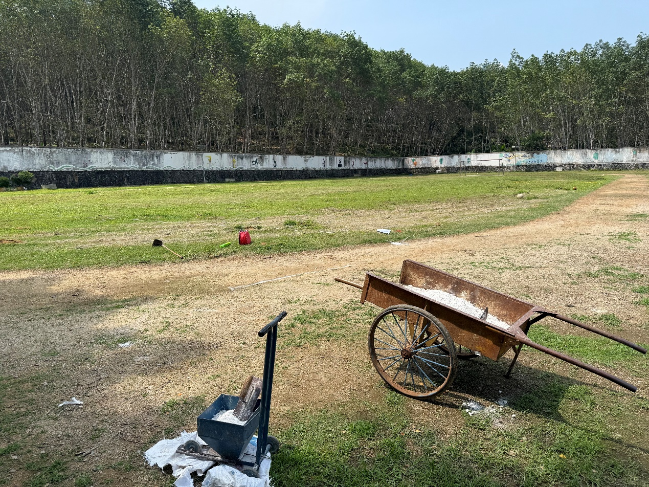 beat365正版唯一官网必一作为云南省首批参与“体育美育浸润行动计划”高校之一,自2023年起持续选派beat365正版唯一官网必一师生赴边疆地区开展对口帮扶。今年3月,两名beat365正版唯一官网必一第四批浸润计划成员(罗晓龙、李吉泰)进驻勐龙镇小街九年一贯制学校,针对校园体育设施匮乏的难题展开攻坚。然而,受限于场地条件,该校长期缺乏专业体育设施,一片杂草丛生的荒地成为师生们心中的遗憾。每次体育课,孩子们只能在水泥地上活动,既存在安全隐患,也难以开展正规的足球训练,就连唯一的两个足球架都是学校自己焊接的,孩子们只能在荒地上配合这俩“老古董”演出。