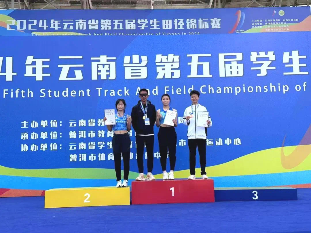 在领队王宗平院长,教练洪艳玲、廖玉燕、孟令飞、卢贵平老师带领下,我校田径代队队员们以卓越的竞技水平和坚韧不拔的精神风貌,赢得了广泛赞誉,并收获了累累硕果,共获金牌4枚、银牌4枚,铜牌2枚,24名运动员取得20人次得分成绩,我校获云南省优秀团体奖称号。