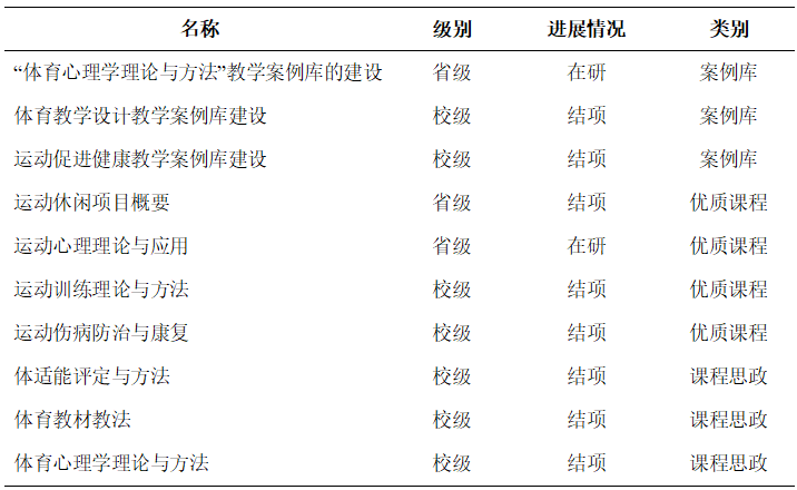 其中,运动休闲项目概要、运动心理理论与应用等2门课程为省级优质课程;运动伤病的防治与康复、运动训练理论与实践等2门课程为校级优质课程;运动促进健康、体育教材与教法设计、体育心理学理论与方法等3个教学案例库为云南省专业学位研究生教学案例库建设项目。
