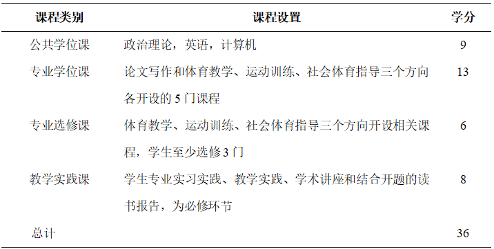 体育专业硕士研究生应掌握系统的专业性知识,本学位点通过开设公共课、专业领域核心课、选修课和实践训练帮助研究生建立专业知识体系,提高学生的就业能力。其中三个专业领域的核心课程为体育教学专业:论文写作、体育课程导论、体育教材教法、运动技能学习原理、体适能评定与方法和体育心理学理论与方法;运动训练专业:论文写作、运动训练理论与方法、运动心理理论与应用、运动训练的科学监控、运动伤病的防治与康复和体能训练理论与方法;社会体育指导专业:论文写作、社会体育学、健身理论与实践、运动处方、社会体育管理与实务、运动休闲项目概要。