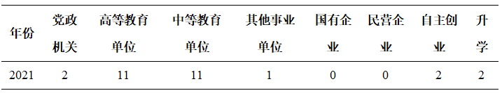 学校、学院高度重视学生的就业工作,成立了领导小组,并且签订了毕业生就业工作责任书,严抓毕业生就业工作。学院设立毕业生就业专项经费,举办毕业生就业讲座,开展各种资格证书培训以增强毕业生进入社会的就业竞争力。体育专业硕士毕业生的就业领域广泛,学生毕业后的就业去向包括:党政机关、高等教育单位、中初等教育单位、其他事业单位和国有、民营企业、自主创业和升学为主要就业渠道,具体见下表。2021年有2名硕士研究生考取博士,进行深造。